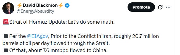 I got to thinking about how the math might work if some recent developments all come together as planned related to the shutdown of tanker traffic through the Strait of Hormuz, and put it in an X post a little bit ago: