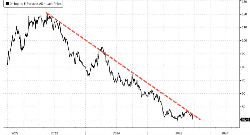 Shares of Porsche AG plunged again on Monday, continuing a disastrous two-year decline. The venerable car company’s latest 8% drop came as it dropped its plans for a proposed battery-powered luxury SUV and said it was refocusing capital investments back to traditional gas-powered cars.